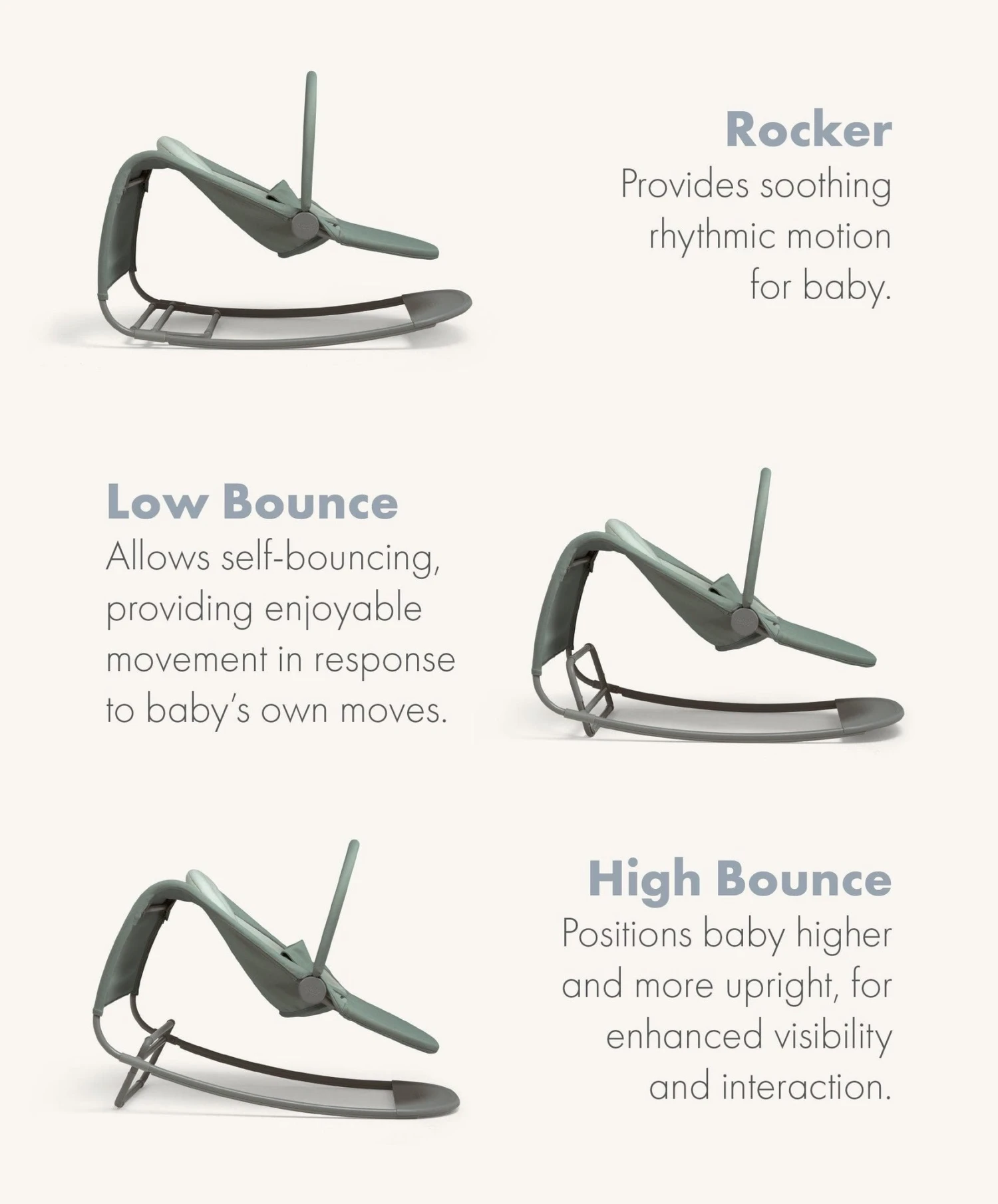 - Low and high bounce functions allow for self-bouncing, providing enjoyable movement in response to baby’s own moves.
