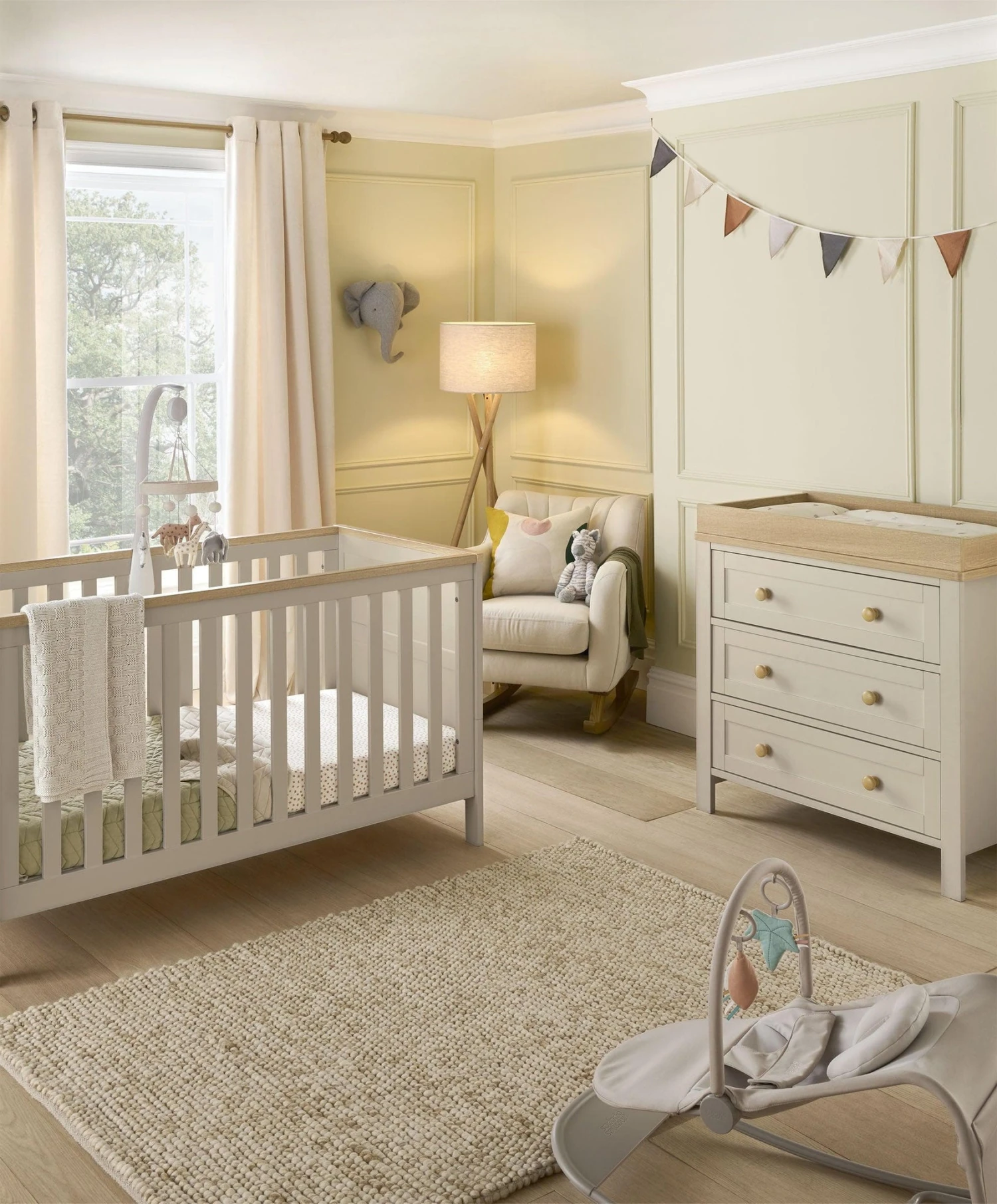 The collection’s thoughtful two-tone natural wood-effect finish ties the pieces together, creating a unified and soothing nursery space. The curved edges on all pieces not only look refined but also ensure a safer environment for your little one. This furniture bundle is not only a practical choice but also a stylish investment in your baby’s first room.