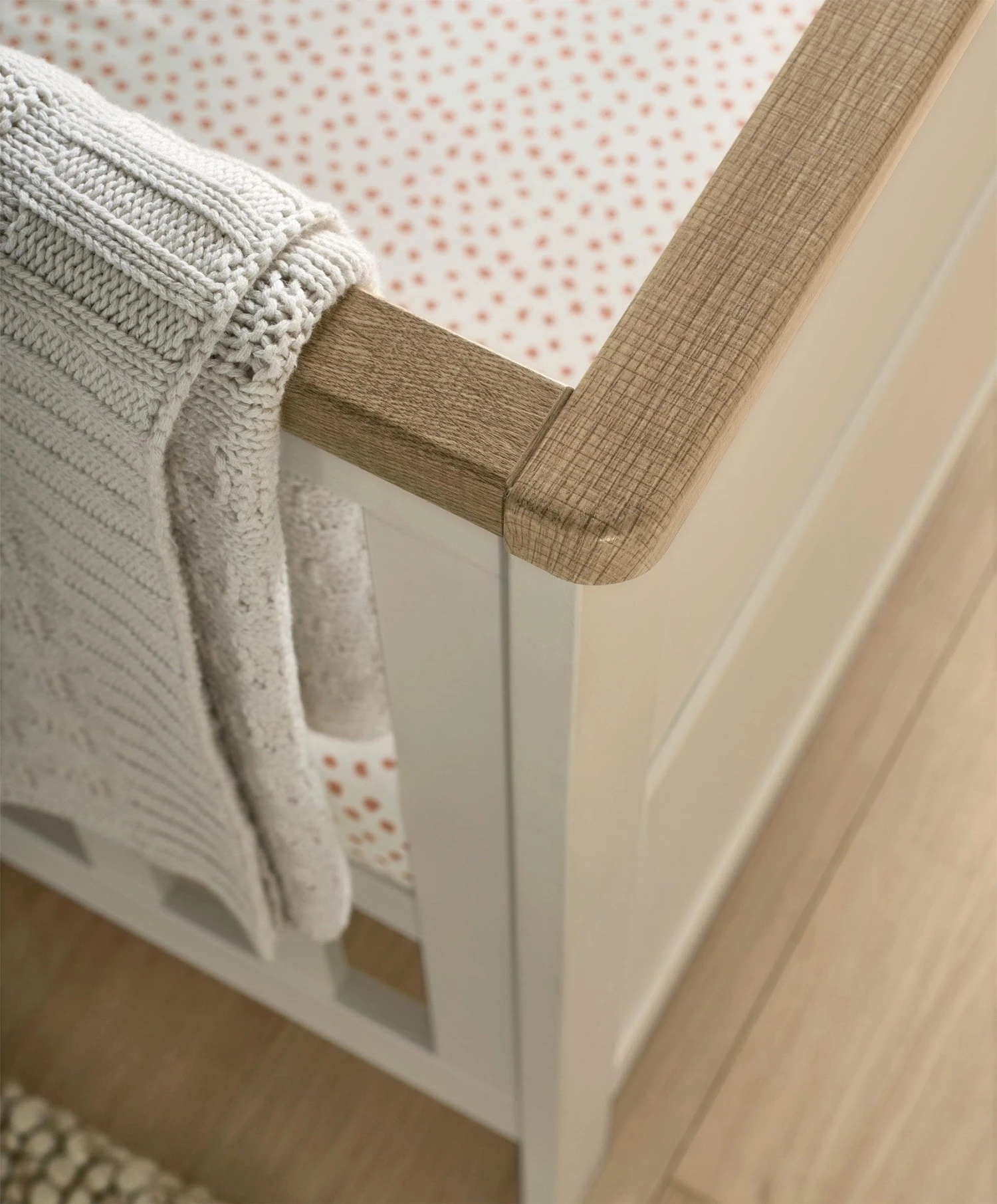 The dresser and changer combo is as practical as it is stylish. With spacious drawers designed for storing nappies, clothes, and essentials, you’ll always have what you need close at hand. The top surface doubles as a changing area, offering convenience during nappy changes, and can later be used to display keepsakes or books as your child grows. The two-tone finish with the natural wood adds a serene, warm charm, while the curved edges complete its classic, cohesive look.